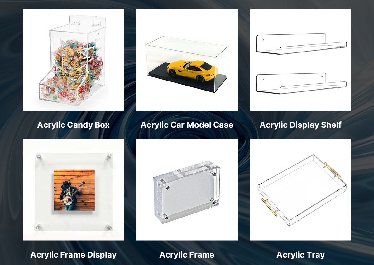 Productos principales:Exhibición de acrílico, caja de acrílico, hoja de acrílico, soporte de acrílico, organizador de acrílico